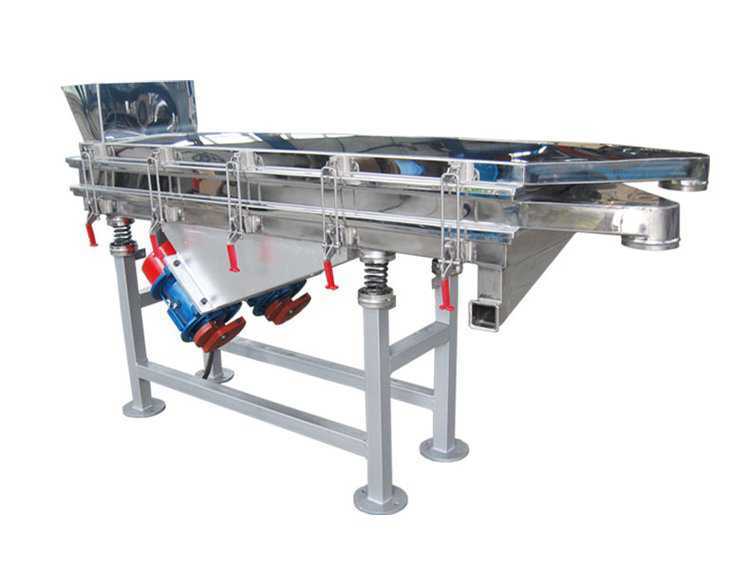 直線振動(dòng)篩是采用雙振動(dòng)電機(jī)驅(qū)動(dòng),當(dāng)兩臺(tái)振動(dòng)電機(jī)做同步、反向旋轉(zhuǎn)時(shí),其偏心塊所 產(chǎn)生的激振力在平行與電機(jī)軸線的方向相互抵消,在垂直與電機(jī)軸的方向疊為一合力,因此篩機(jī)的運(yùn)動(dòng)軌跡為一直線。兩電機(jī)軸相對(duì)篩面有一傾角,在激振力和物料自重力的合理作用下,進(jìn)入設(shè)備的物料在篩面上被拋起,跳躍式向前做直線運(yùn)動(dòng),通過多層篩網(wǎng)產(chǎn)生數(shù)種規(guī)格的篩上物、篩下物,分別從各自的出料口排出,達(dá)到篩選和分級(jí)的目的。